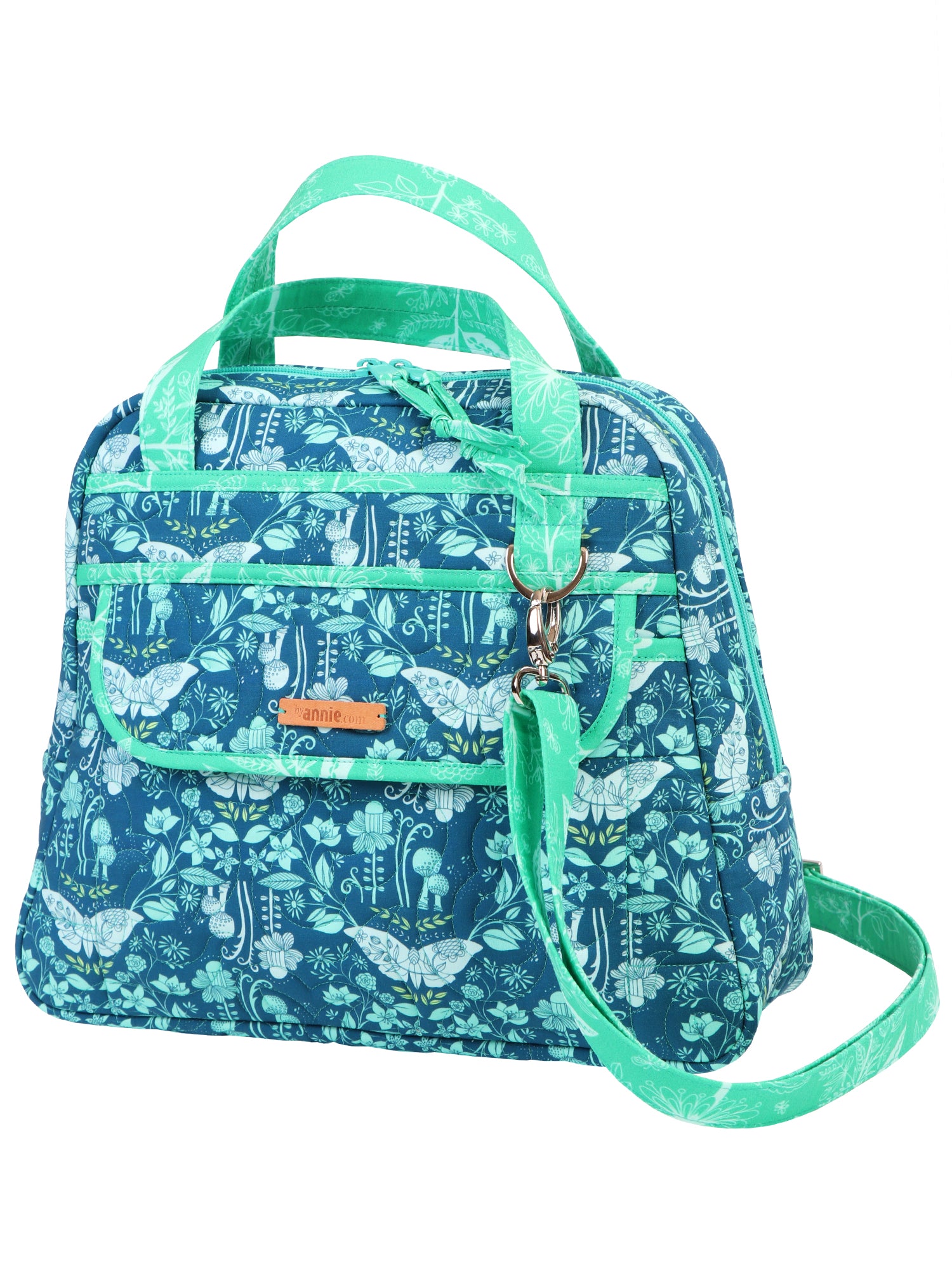 This fun-to-make bag features a classic bowler silhouette with easy-to-grab handles and an adjustable, detachable carrying strap. The main compartment opens wide for easy access to the bag's contents. Keep everything organized with three elasticized slip pockets and a full-height zippered mesh or fabric pocket on the inside. The exterior features a full-height zippered pocket made of quilted fabric on the back and a quilted pocket on front that closes with a magnetic snap flap.